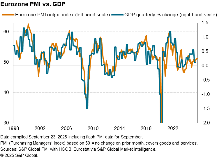 Modest growth was again recorded in the eurozone in September, the pace of expansion edging higher for a fourth month in a row. At 51.2, up from 51.0 in August, the HCOB Flash Eurozone Composite PMI Output Index, based on approximately 85% of usual survey responses and compiled by S&P Global, signalled an expansion of activity for a ninth successive month.