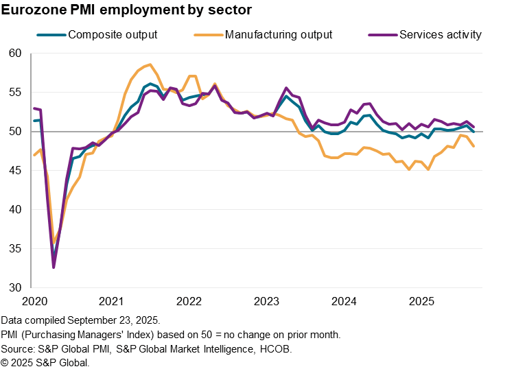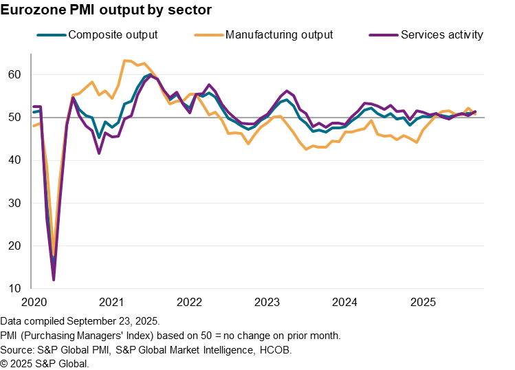 Eurozone businesses reported the fastest output growth for 16 months in September, though the overall rate of expansion remained only modest in a sign that the region's upturn is struggling to gain momentum. Sluggish service sector growth was accompanied by a slowdown in manufacturing, where companies reported an increased loss of export sales thanks partly to the fading effect of tariff front-running. Business optimism also waned, led by reduced expectations of growth in the manufacturing sector. Staffing levels were unchanged, underscoring the lack of meaningful growth momentum.