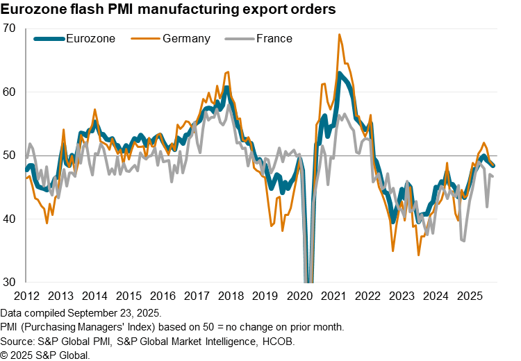 In manufacturing, trends have been distorted lately by the front-running of US tariffs. Having stabilized in May for the first time in 40 months, aided by shipments to the US ahead of US tariffs, eurozone goods exports have fallen back into decline in a sign of this front-running effect waning. September's export decline was the sharpest since March. The further anticipated unwinding of this tariff front-loading poses downside risks to production in the coming months.