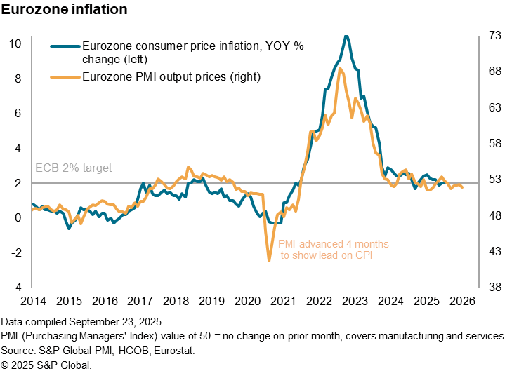 Inflation pressures meanwhile moderated, the overall rate of selling price inflation across goods and services down to a four-month low in September and broadly consistent with inflation running just below the ECB's target of 2%, where it has sat in the three months to August.
