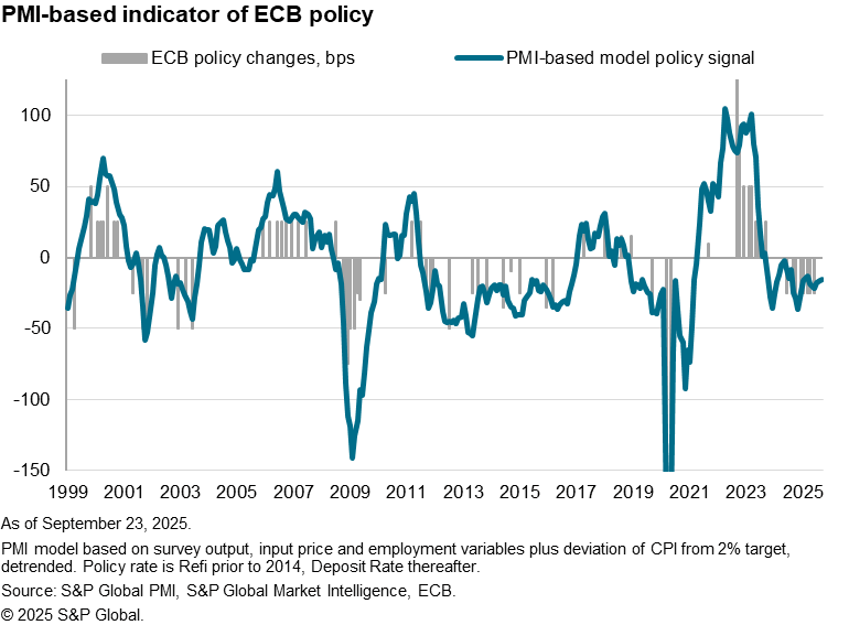 However, the bar to further imminent rate cuts is likely to be high. The ECB has already cut interest rates by 25 basis points eight times in this cycle, taking the Deposit Rate to 2.00% from a peak of 4.00% in the spring of 2024. It will likely take a more worrying weakness in the demand picture than that signalled by September's PMI to lead the ECB to cut rates again this year, though much will depend on the growth trajectory going forward.