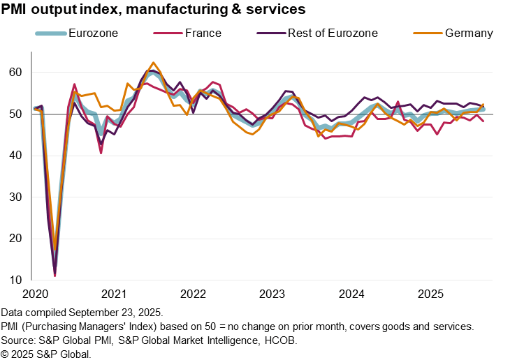Within the region, conditions contrasted in the eurozone's two largest economies. While growth accelerated in Germany to a pace unbeaten since early 2023, France's downturn deepened amid intensifying political uncertainty.
