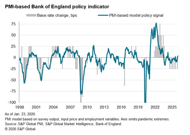 The flash PMI data for January follow a further cut to interest rates by the Bank of England's Monetary Policy Committee in December, which took the Bank Rate down to a three-year low of 3.75%. However, the stronger upturn in output and relatively elevated price pressures hint at rates being held steady in the short-term as policymakers assess the outlooks for prices and growth. One concern will be the ongoing drop in employment, which will add to calls for more stimulus from some rate setters and in our opinion leaves the door open to further rate cuts in 2026 if the inflation trend permits.