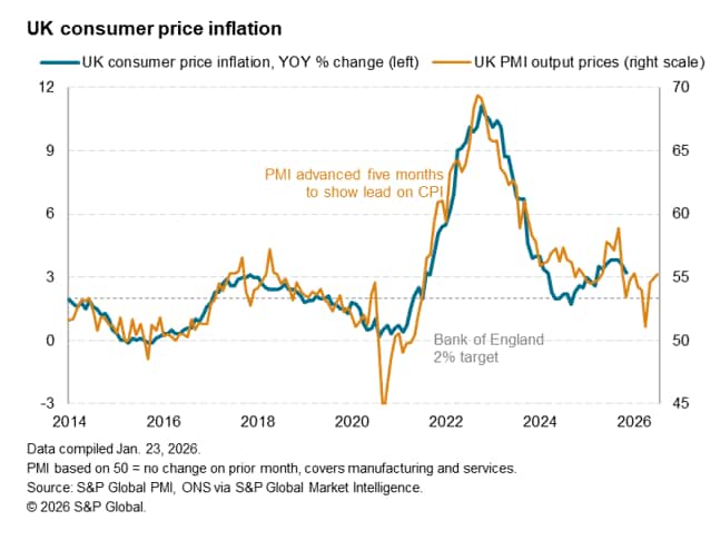 Comparisons with official inflation data suggest that the PMI survey's selling price gauge is broadly indicative of consumer price inflation running at around 3% into the second half of 2026, and therefore above the Bank of England's 2% target, albeit with some downside potential for inflation in the near-term.