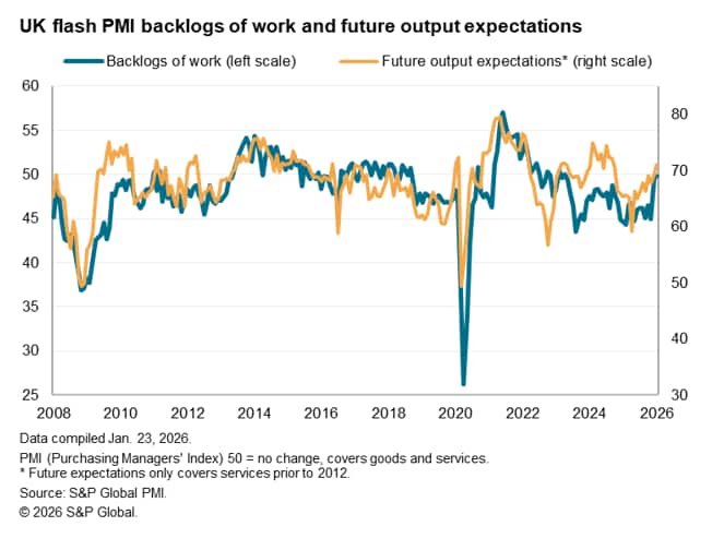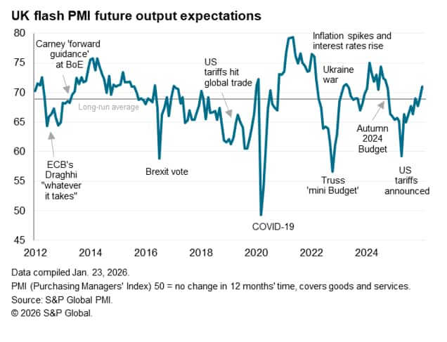 Higher activity levels and rising inflows of new business helped drive an improvement in business expectations about growth over the coming year to the highest since September 2024, after which the policies announced in that year's Autumn Budget dampened the business mood. Optimism regarding future output rose to its highest for over a year in both manufacturing and services.