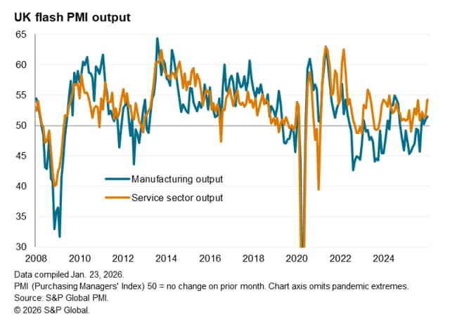 UK businesses are starting 2026 with the fastest output growth since April 2024.The PMI headline Composite PMI Output Index rose from 51.4 in December to 53.9, a 21-month high and one of the best readings since the 2022 rebound in business activity after the COVID-19 pandemic. The current PMI is broadly consistent with GDP growing at a near 0.4% quarterly rate in January, representing a marked improvement on the modest 0.1% gain signalled for the fourth quarter as a whole.