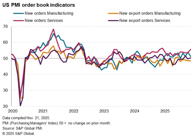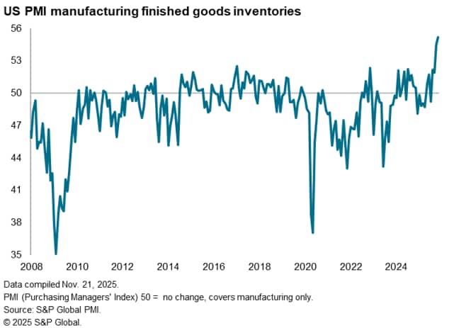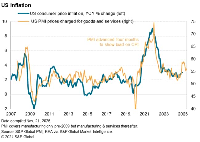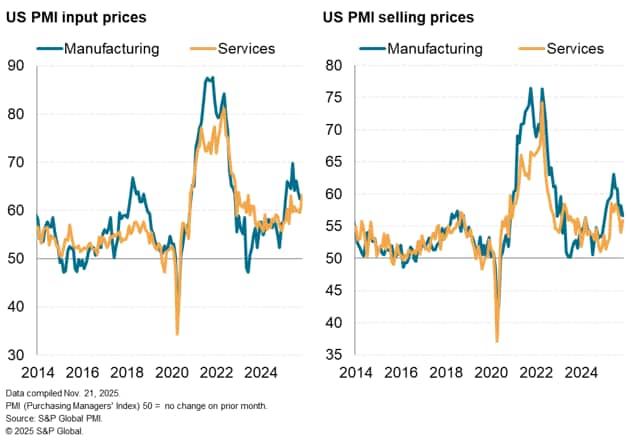 Input cost inflation accelerated sharply in November, hitting the fastest rate for three years barring the jump in costs seen in May. Tariffs were again the predominant reason cited by companies for increased costs, alongside reports of higher wage rates. Service sector costs rose at the fastest rate since January 2023. In contrast, manufacturing input price inflation cooled to the lowest since February but remained well above the average seen over the past three years.