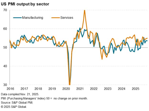 A further acceleration of economic growth was signalled in November as the headline S&P Global US PMI Flash Composite Output Index rose for a second successive month, up from 54.6 in October to 54.8, according to the 'flash' reading.