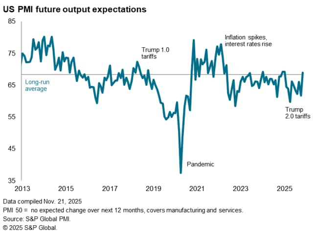 Companies' expectations about output in the year ahead jumped to the highest recorded since January. Optimism hit a five-month high in manufacturing and an 11-month record in services. The improvements took confidence above long-run averages in both sectors.