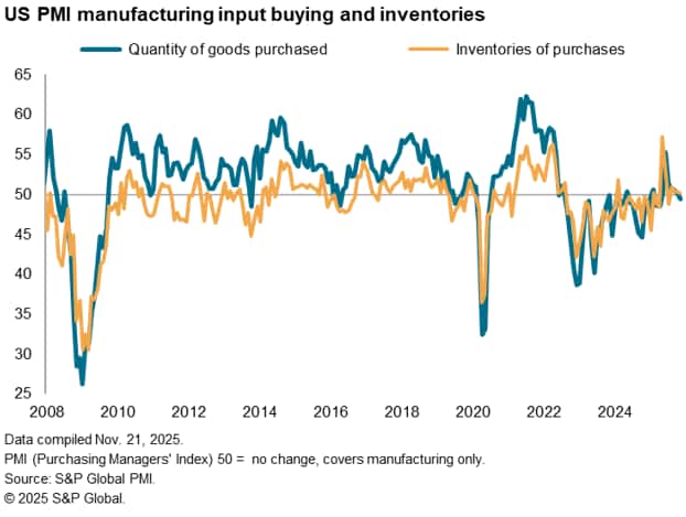 The accumulation of inventories led to a reduction in the volume of inputs purchased for the first time since April, with prior months having seen higher purchases driven by efforts to buy materials ahead of potential tariff-related prices rises or supply shortages.