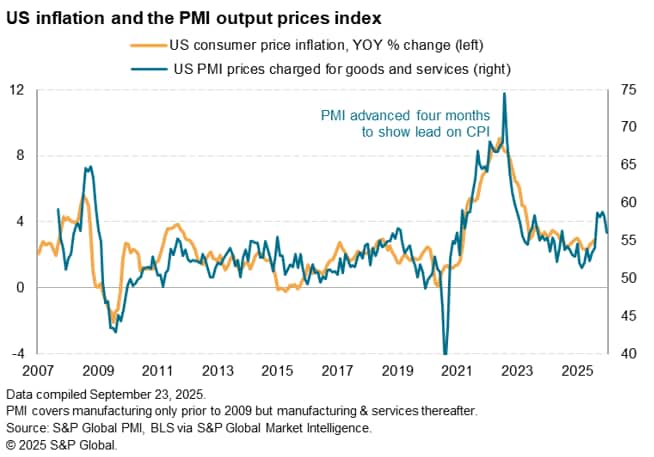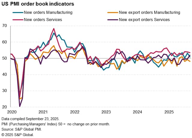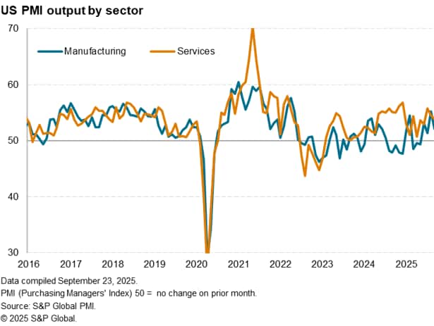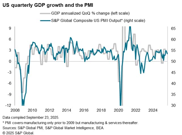 The headline S&P Global US PMI Composite Output Index fell from 54.6 in August to 53.6 in September, according to the 'flash' reading (based on about 85% of usual survey responses). However, although signaling a weakened rate of growth for a second successive month, the still-elevated PMI reading indicates that the third quarter a whole has seen the strongest average monthly expansion since the fourth quarter of 2024. The survey data are consistent with the economy expanding at a 2.2% annualized rate in the third quarter.