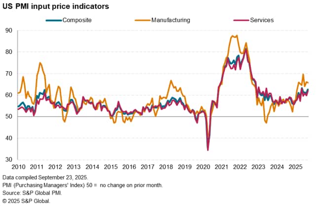 Tariffs were again overwhelmingly cited as the principal cause of further cost increases in September, most evidently in the manufacturing sector. Manufacturing input price inflation remained elevated at one of the highest rates since the pandemic, albeit dipping slightly since August. Service sector inflation meanwhile hit the second-highest recorded over the past 27 months.