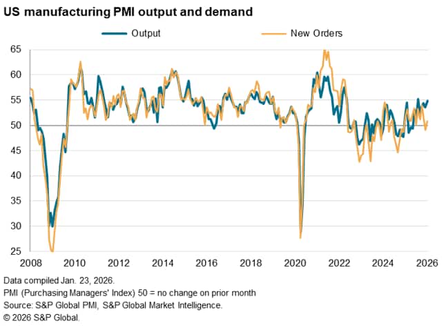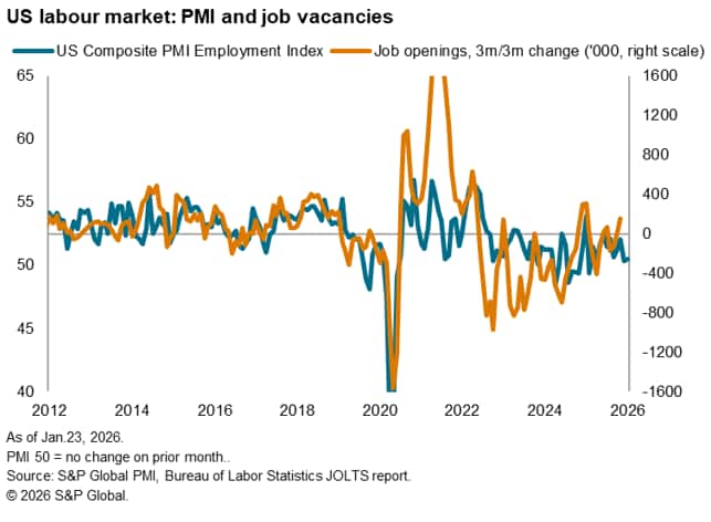 The headline S&P Global US PMI® Composite Output Index signalled ongoing growth of business activity at the start of 2026. Output has now grown continually for exactly three years. However, at 52.8, up fractionally from 52.7 in December, the 'flash' reading (based on about 85% of usual survey responses) signalled only a marginal improvement in growth from December's eight-month low.
