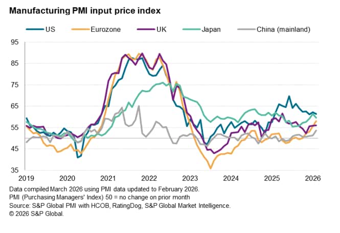 Prices in mainland China rose at the sharpest rate since June 2022, contributing to the steepest rise in pan-Asia prices since October 2022. Eurozone input cost inflation hit the highest since December 2022 and US prices also continued to rise sharply, albeit the rate of increase down from 2025 highs, often blamed on tariffs.