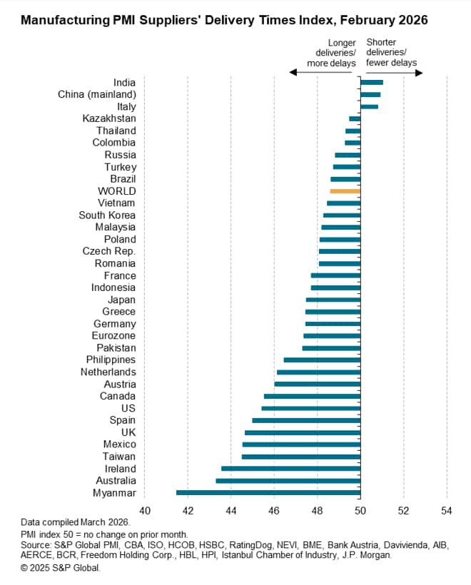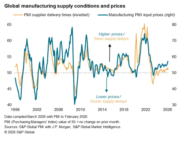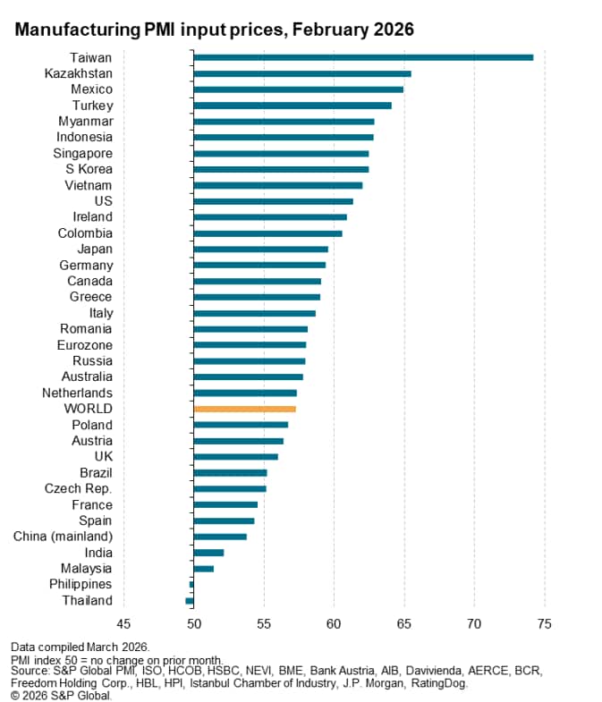 Global manufacturing input costs rose in February at the sharpest rate since 2022 as supply chain bottlenecks added to upward pressure on prices from higher labour costs and US tariffs. Higher energy prices and further supply disruptions from the Iran war look likely to add further pressure to producer price inflation in March.