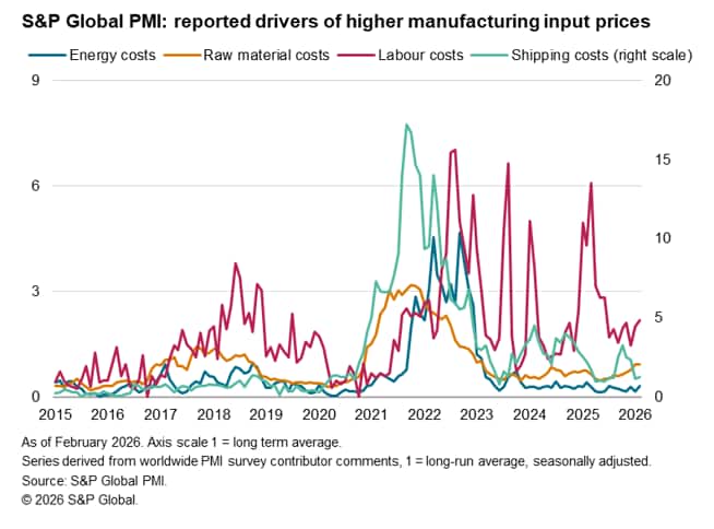 Since the attacks, energy prices have risen sharply and supply chains have been disrupted, notably via concerns over attacks on shipping through the Strait of Hormuz. We note that, according to comments from PMI contributors in the February survey, the rise in manufacturing costs was neither a reflection of energy prices nor shipping costs, suggesting these factors could add to inflation pressures in the March survey, exacerbating the existing price drivers of rising labour costs and a broader rise in raw material prices.