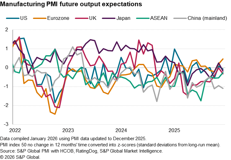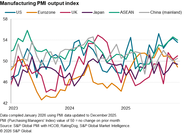 Worldwide manufacturing business survey data showed ASEAN factories reporting the strongest output growth in 2025 on average, while eurozone producers reported the weakest expansion. However, forward-looking sentiment data put eurozone producers on the best footing for growth in 2026 of the major regions, contrasting with below-average sentiment in North America and Asia, albeit with some important divergences within these regions.