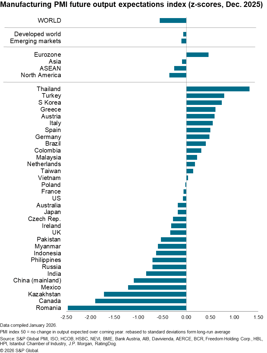 These scores reveal that, although eurozone manufacturers reported the weakest expansion of production of all major regions in 2025, they ended the year with the highest optimism of all regions. Eurozone output expectations in fact rose in December to their highest since February 2022. Firms in North America are meanwhile the most pessimistic relative to their long-run average. Pessimism in the latter is led by Canada and Mexico, but also extends to the US.