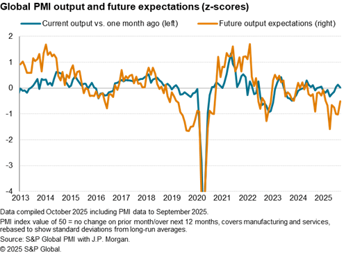 Business expectations about growth in the year ahead slipped globally to the lowest since the early months of the pandemic barring only October 2022 (when the UK's Budget crisis exacerbated wider concerns over global geopolitical tensions and rising interest rates) and April of this year (after new US tariffs were announced).