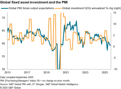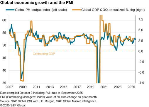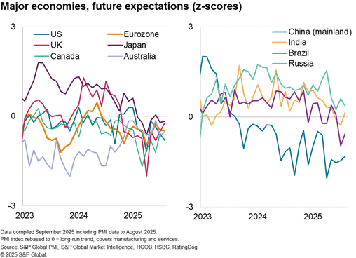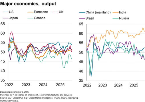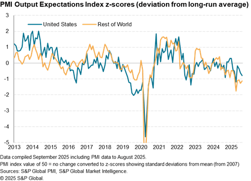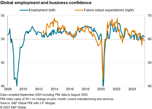 However, business confidence in prospects for the year ahead fell to one of the lowest levels seen since the pandemic, generally reflecting concerns over the impact of US policy changes, notably in relation to tariffs. The gap between current output and expected future output has consequently widened further globally in August, presenting increased downside risks to the sustainability of the recent upturn.