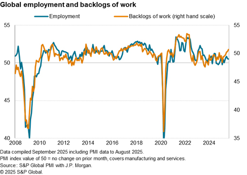 Higher backlogs of work in turn helped encourage firms globally to take on additional staff for a fourth month in a row. However, the rate of job creation remained only modest, and lower than would be consistent with current backlogs growth, according to historical comparisons.
