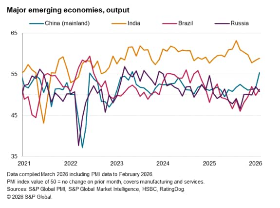 Although India continued to report the fastest output growth among the four largest "BRIC" emerging economies in February, as has been the case over the past four years, the biggest change was recorded in mainland China, where the rate of growth accelerated sharply to the fastest since May 2023.