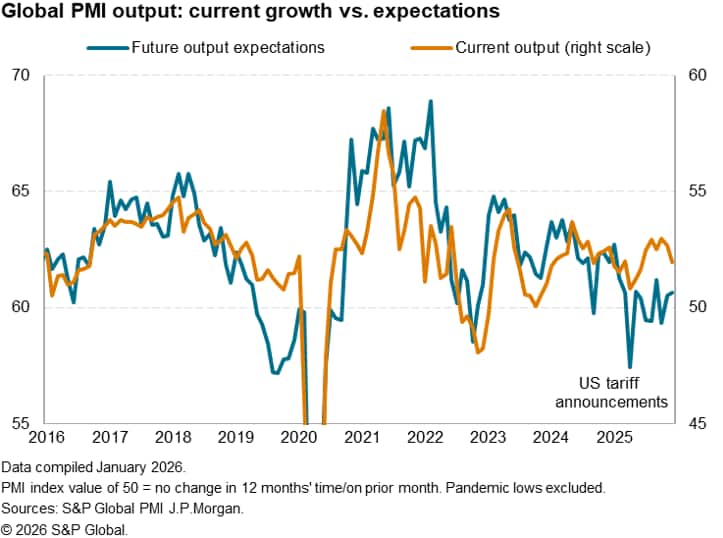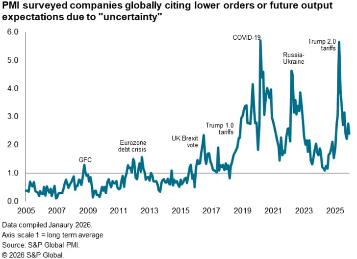 Company reports of "uncertainty" having dampened order books or subdued growth expectations are down from the spike seen in the immediate aftermath of US tariff announcements back in April 2025, but remain elevated, especially by pre-pandemic standards. The PMI's measure of global uncertainty fell back to a near-normal level in early 2024 (defined as approaching the long-run average of 1.0), but remained nearly 2.5 times above normal in December.