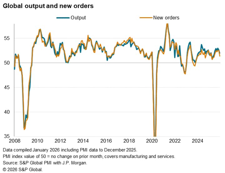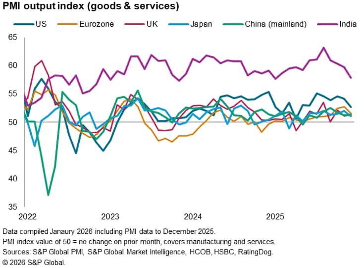 Regionally, the slowdown reflected notably weaker trends in two important growth drivers. The US and India, which had led the global expansion in prior months, both lost considerable momentum at the end of 2025. With growth elsewhere throughout much of the world remaining stubbornly subdued - notably in the eurozone and UK, Japan and mainland China. The slowdowns in the US and India mean the principal growth engines of the developed and emerging markets seem to no longer be firing on all cylinders.