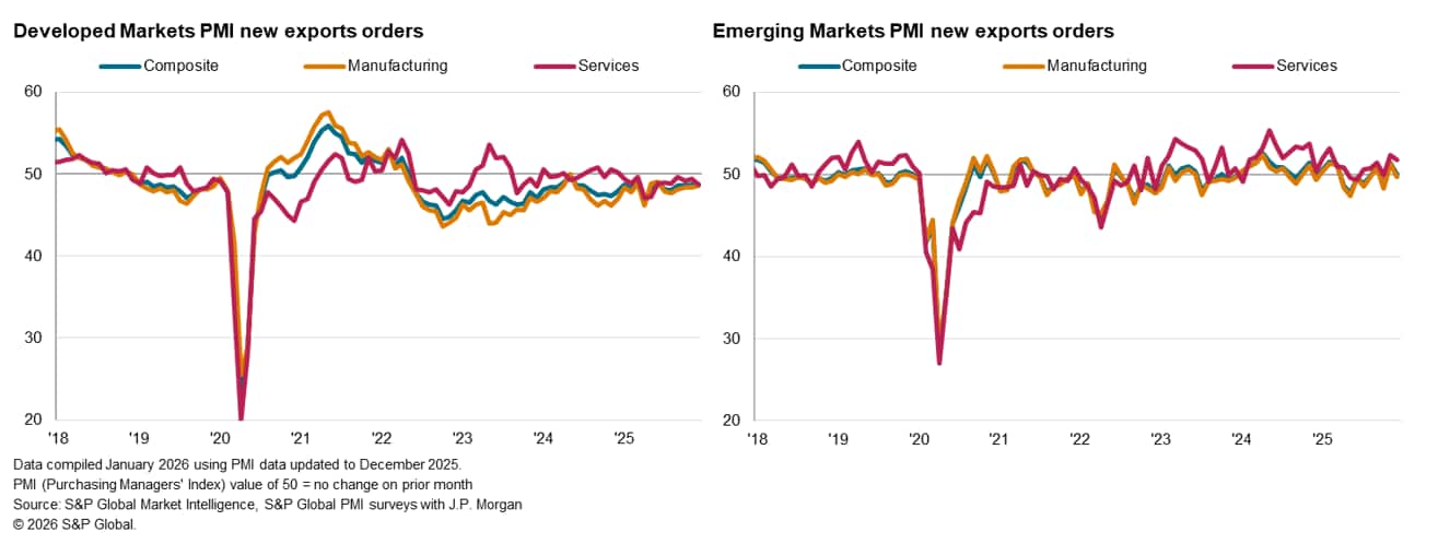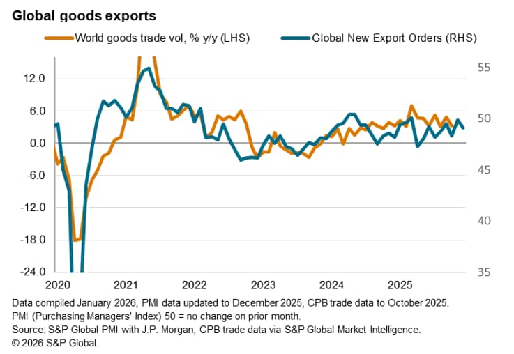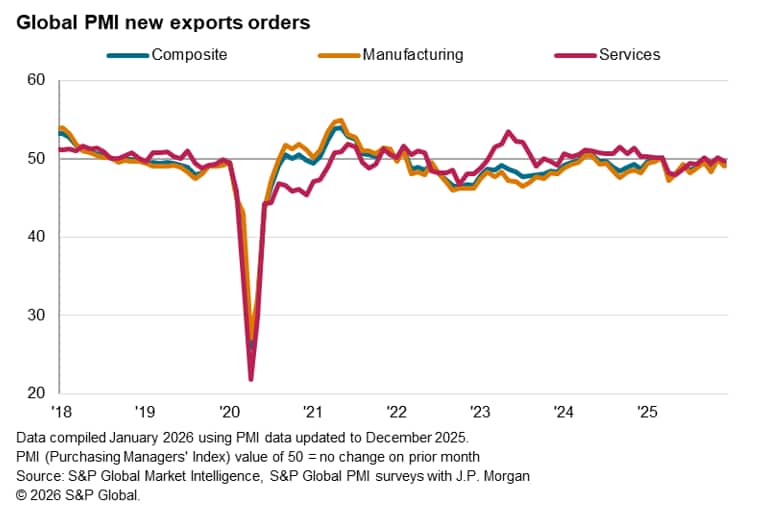 The worldwide Purchasing Managers' Index (PMI) surveys compiled by S&P Global Market Intelligence indicated a fresh decline in global trade in the closing month of 2025. The seasonally adjusted Global PMI New Export Orders Index, sponsored by J.P.Morgan and compiled by S&P Global, slipped to 49.2 in December, down from a neutral reading of 50.0 in November. Absent the stabilisation in November, global trade has deteriorated continuously since April 2025.