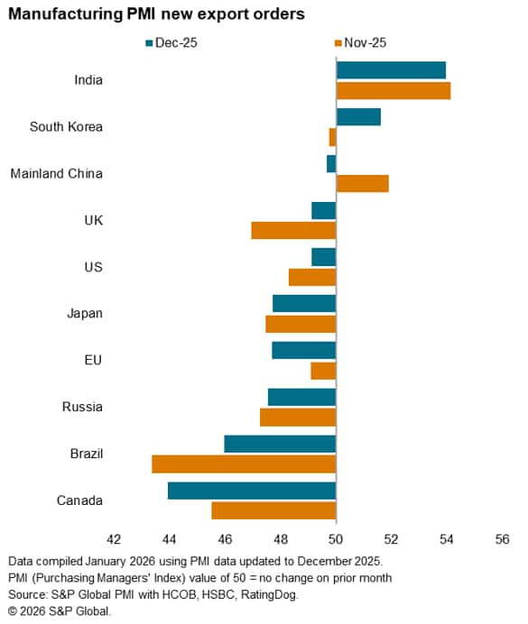 The number of top ten trading economies recording higher goods exports remained at just two for a third straight month in December. Changes were seen again with South Korea replacing mainland China in being the only economy beside India recording growth in goods new export orders at the end of 2025. Though modest, the latest upturn in South Korean exports was the first in three months, driven by improvements in demand from key markets, according to manufacturers. This further supported an improvement in overall manufacturing conditions in South Korea.