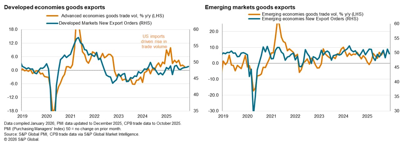 Following a brief expansion in November, emerging markets saw no change in new export business at the end of 2025. This was attributed to a fresh fall in goods new export orders, though growth in services new export business also slowed from November. The downturn in trade was mainly driven by a reduction in exports from mainland China. Excluding mainland China, total new export orders rose at the fastest pace since February 2025 across emerging markets.