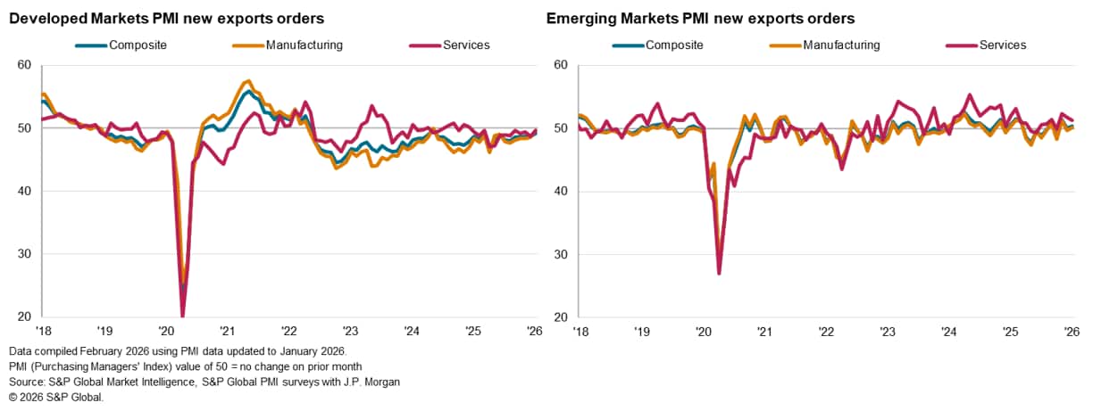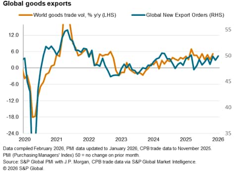 The worldwide Purchasing Managers' Index (PMI) surveys compiled by S&P Global Market Intelligence indicated a near-stabilisation of global trade at the start of 2026. The seasonally adjusted Global PMI New Export Orders Index, sponsored by J.P.Morgan and compiled by S&P Global, rose to 49.7 in January, up from 49.3 in December. Despite indicating a second monthly deterioration in global trade, the pace of decline was only marginal.