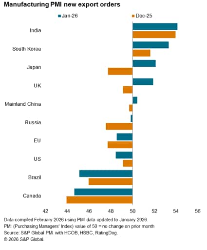 The number of top ten trading economies recording higher goods exports rose from just two in December to five at the start of 2026. Japan, the UK and mainland China joined India and South Korea to record higher goods new export orders in January.