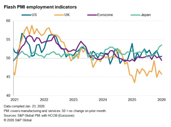 The UK meanwhile continued to see especially steep job losses, as has been the case since late-2024, reflecting reports of the ongoing need to offset higher staffing costs associated with new government policies announced that year.