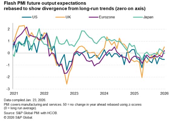 Rebasing the PMI diffusion indices to reflect divergences from long-run trends, business expectations are now running at levels above long-run averages in both the UK and eurozone, reaching 16- and 20-month highs respectively. While confidence slipped to a three-month low in Japan, it was in line with both the long-run average and the average seen in 2025. In contrast, UK business expectations sank further below the long-run average in January, dropping to its lowest since last October.