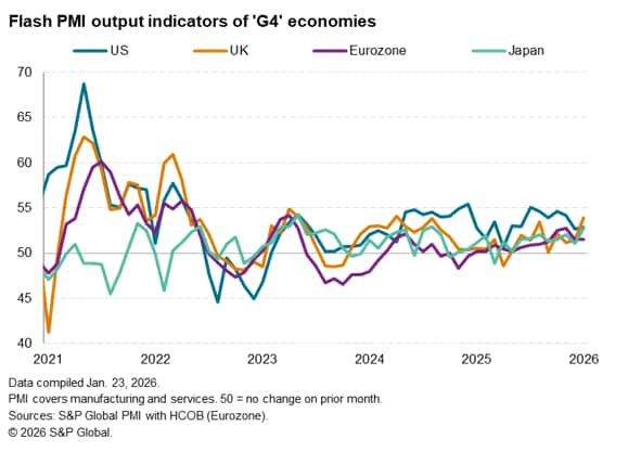 Measured across both goods and services, S&P Global's flash PMI data showed output rising in all four largest developed economies for a ninth successive month in January. The four economies collectively reported a slight acceleration of growth and an overall expansion of output for the twenty-sixth month.