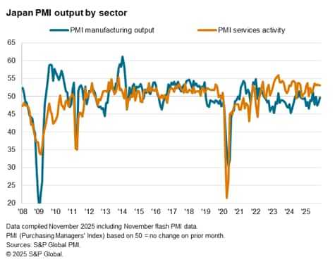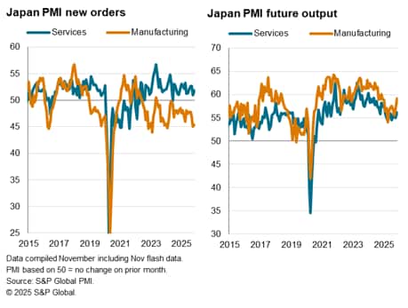 In contrast, manufacturing output fell for the fifth month in a row in November amid another sharp downturn in new orders for Japanese manufactured goods. Despite the reduction in uncertainty related to US tariffs, the pace at which goods new orders fell had eased only slightly from the October low. This was accompanied by a sharper fall in new orders from abroad. Comments from panellists often mentioned clients being conservative with their spending in the current economic backdrop. Some firms also noted that the conclusion of the World Expo in October posed a direct hit to new work inflows.