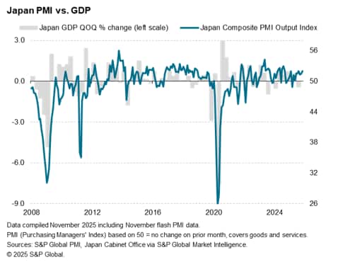 The S&P Global Flash Japan PMI Composite Output Index rose to 52.0 in November, up from 51.5 in October. Posting above the 50.0 neutral mark for an eighth consecutive month, the reading signalled another expansion in business activity. Moreover, the rate of growth was the joint-fastest since August 2024, matched also by those in August, February and last September.