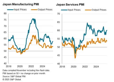 Turning to prices, average input costs continued to increase for Japanese companies in the penultimate month of the year. The rate of input cost inflation was the highest in six months with both manufacturers and service providers facing greater cost pressures in November. Moreover, the rates of inflation were above their respective series averages across both sectors amid reports of rising raw material, rent and wage costs, made worse by a weak domestic currency.
