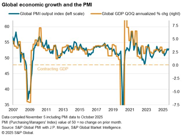 The J.P.Morgan Global PMI Composite Output Index - produced by S&P Global -posted 52.9 in October, down from 52.5 in September. The latest reading was the joint-highest in nearly one-and-a-half years. At its current level, the PMI is broadly consistent with global GDP growing at an annualized rate of 3.0%, which is slightly higher than the 2.8% signalled for the third quarter. Moreover, the indicated growth rate of 3.0% was close to the average GDP growth rate of 3.1% observed in the decade prior to the pandemic, signalling a return to trend growth.