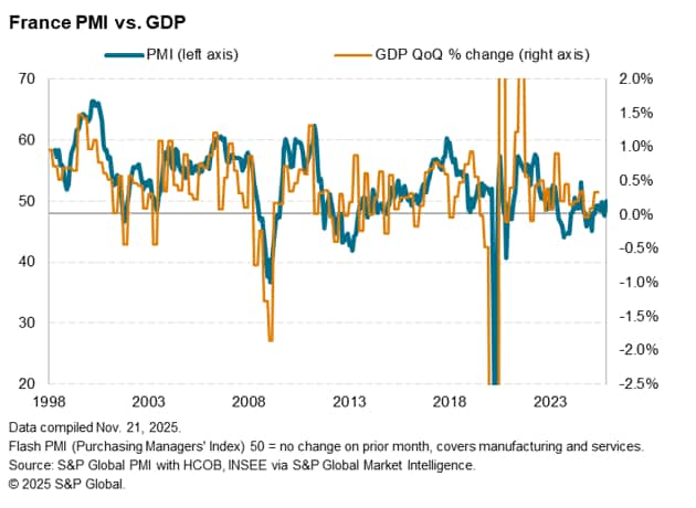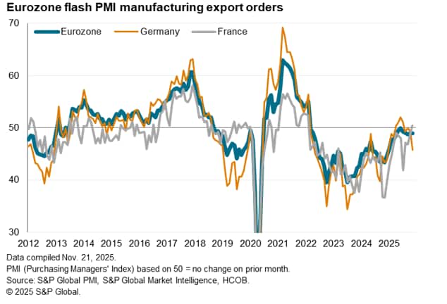 Measured overall, the flash PMI data are indicative of GDP rising at an approximate 0.3% quarterly pace in Germany so far in the fourth quarter but signal broadly stalled French economic growth of just under 0.1%.