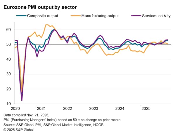 A solid rise in output in November after an improved performance in October represents the best back-to-back monthly expansions for eurozone businesses since the spring of 2023. The seasonally adjusted HCOB Flash Eurozone Composite PMI Output Index, based on approximately 85% of usual survey responses and compiled by S&P Global, posted 52.4 in November, down only fractionally from 52.5 in October and therefore signalling a further solid monthly rise in business activity.