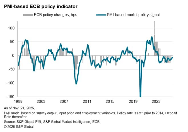 A composite ECB policy indicator based on key PMI gauges suggests an ongoing easing bias to policymaking. However, this indicator has risen to its highest since May 2024 to suggest that the economic environment is moving toward a more neutral interest rate setting.