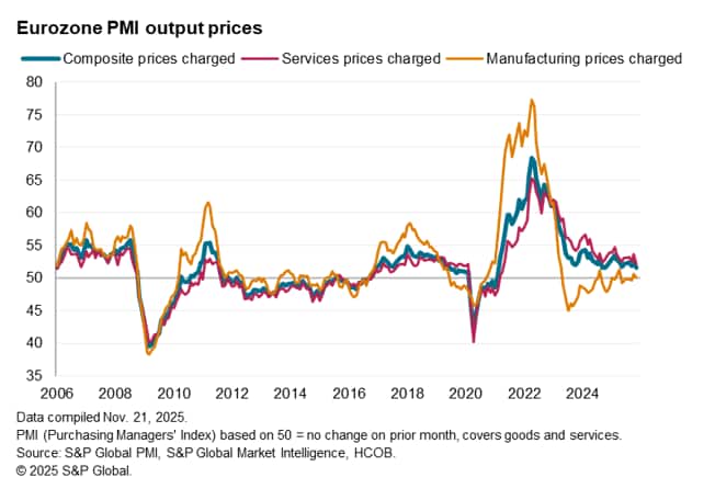 Output price inflation cooled in November, slowing to the weakest in just over a year and pointing to only a modest monthly rise in charges across the eurozone. Manufacturers kept their selling prices unchanged, while in services the pace of inflation eased to the slowest since April 2021.