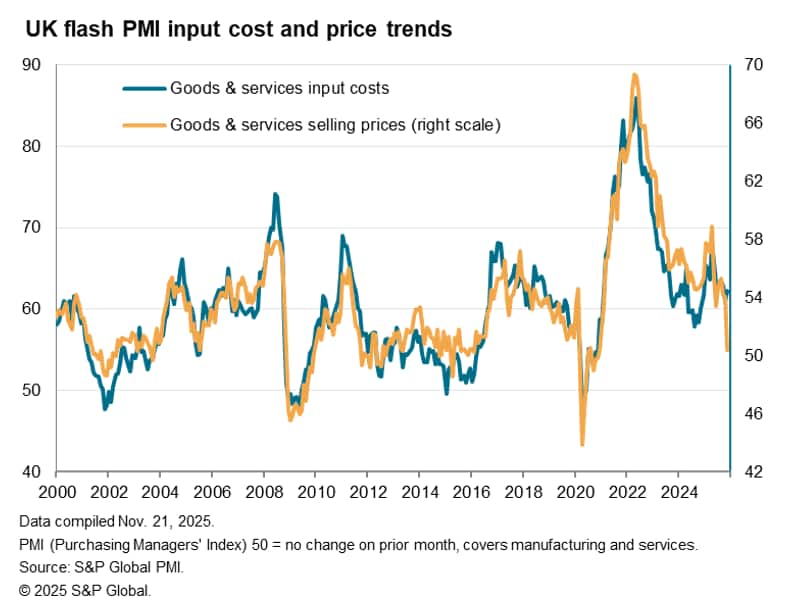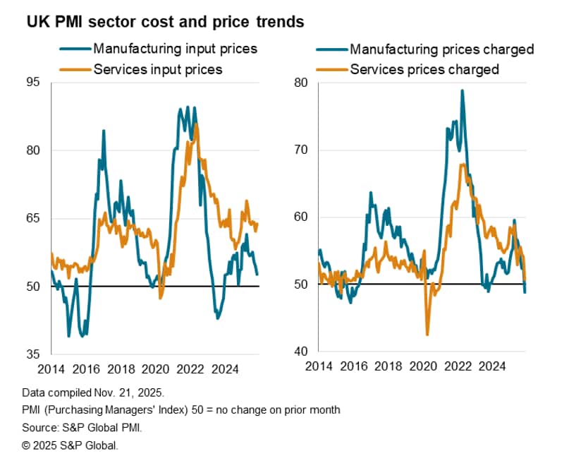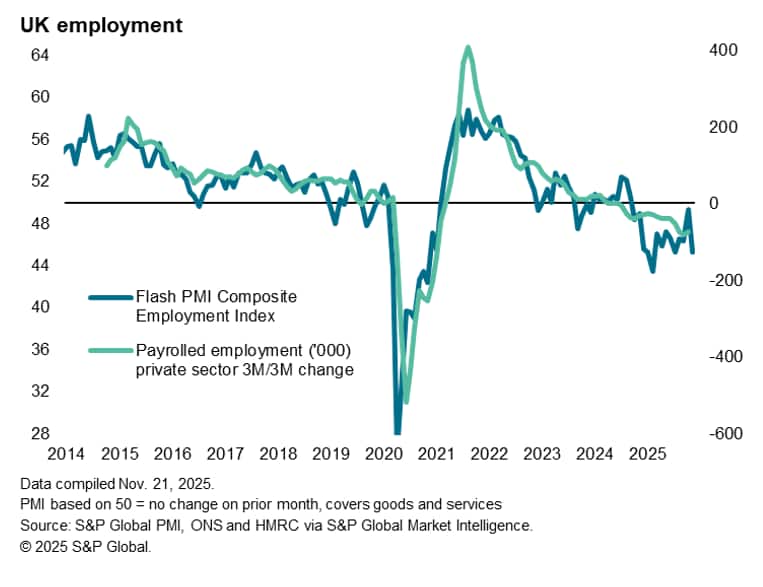 The lack of orders and loss of optimism about the business outlook, combined with the increase in staffing costs stemming from last year's Budget, were all cited as reasons for an increased rate of job losses in November. Employment fell at the fastest rate since July, and one of the steepest rates seen since the pandemic. The PMI panels have reported a continual fall in employment since October 2024, when policy measures including higher employer National Insurance contributions and an increased Minimum Wage were announced.