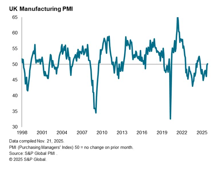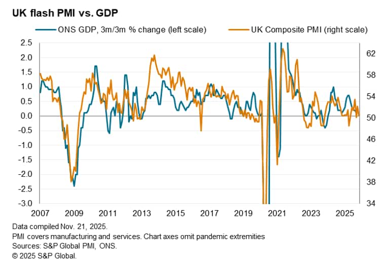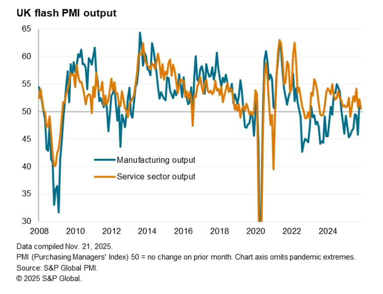 UK business activity growth slowed to only a very modest pace in November, widely linked to uncertainty ahead of the upcoming Budget. At 50.5, down from 52.2 in October, the PMI headline composite output index was the second-lowest seen over the past six months, according to the initial flash estimate. At this level, the PMI is broadly consistent with GDP stalling in November and having grown at a 0.1% quarterly pace so far in the fourth quarter. This follows a 0.1% rise in GDP in the third quarter (as had been signalled in advance by the PMI).
