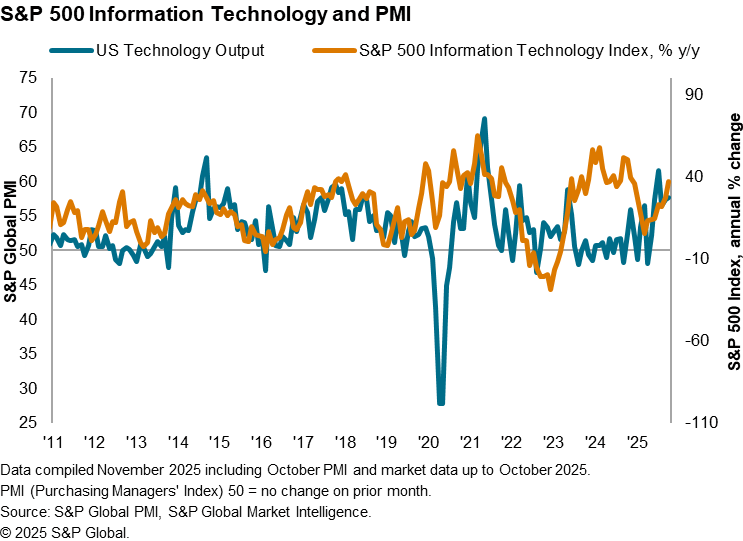 However, a comparison between the S&P 500 technology sector index and the US Technology sector PMI highlighted a divergence in trends going into the start of the fourth quarter, with IT stocks rising at a pace much faster compared to the trend for the technology sector output in October. This will be worth monitoring with increased risk of equity prices deviating further from economic performance under the lead of the IT sector.