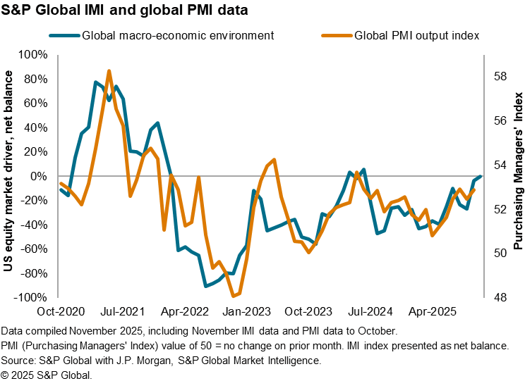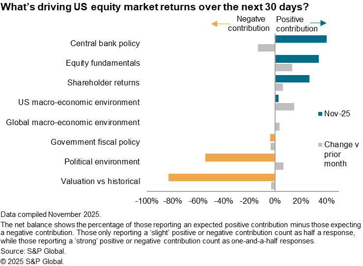 While the latest S&P Global Investment Manager Index (IMI) indicated that risk sentiment improved markedly among US equity investors in early November, only limited improvements in expected returns for the near-term were observed, reflecting concerns over valuations and the political environment's impact on US equities.