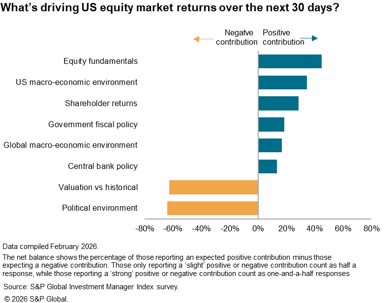 An assessment of what is driving returns in the near-term showed that US equity investors remain highly concerned about the political environment and valuations at the start of February. However, positive expectations regarding central bank policy were also greatly pared back from January as markets priced in a lower chance of rate cuts in the few months of the year.