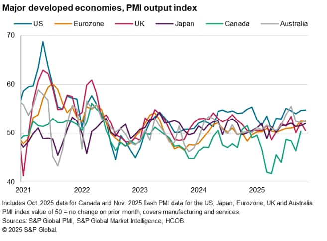 The November PMI survey data follow provisional flash PMI releases which pointed to an ongoing US outperformance among the major developed economies in terms of both manufacturing and service sector growth. However, eurozone business growth was sustained at one of the strongest rates seen over the past two and a half years, and Japan's growth rate remained one of the highest recorded in the past year. The good news was tempered, however, by growth coming close to stalling in the UK amid uncertainty ahead of the Autumn Budget.